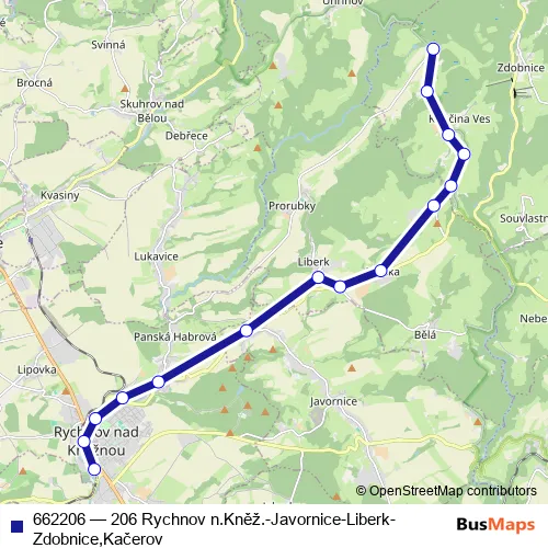 The first stop of the 662206 bus route is Rychnov n.Kněž.,žel.st. and the last stop is Zdobnice,Kačerov,odb.Prorubky. 662206 (206 Rychnov n.Kněž.-Javornice-Liberk-Zdobnice,Kačerov) is operational during on weekdays.