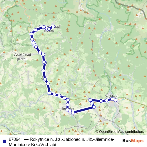 The first stop of the 670941 bus route is Vrchlabí,aut.st. and the last stop is Rokytnice n.Jiz.,Horní Rokytnice. 670941 (Rokytnice n. Jiz.-Jablonec n. Jiz.-Jilemnice-Martinice v Krk./Vrchlabí) is operational during everyday.