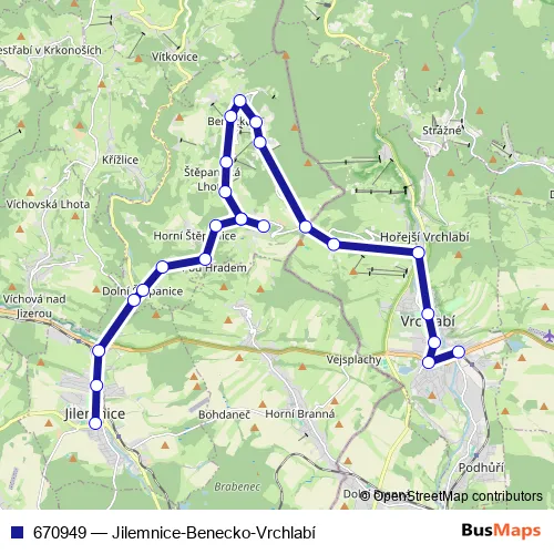 The first stop of the 670949 bus route is Jilemnice,aut.nádr. and the last stop is Vrchlabí,aut.st.. 670949 (Jilemnice-Benecko-Vrchlabí) is operational during everyday.