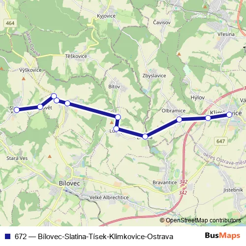The first stop of the 672 bus route is Klimkovice, centrum and the last stop is Slatina. 672 (Bílovec-Slatina-Tísek-Klimkovice-Ostrava) is operational during on weekends.