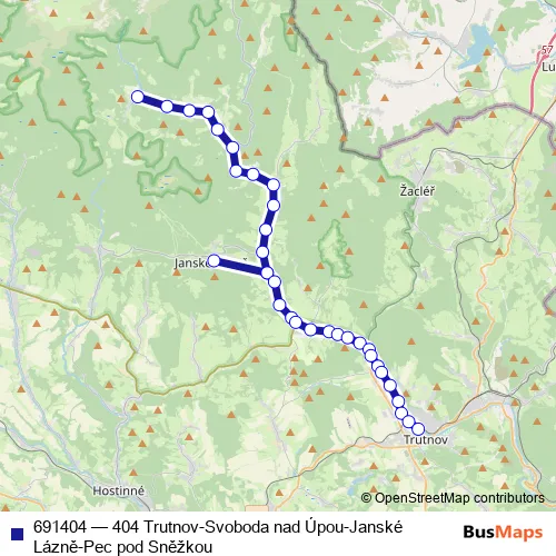 The first stop of the 691404 bus route is Janské Lázně,kolonáda and the last stop is Trutnov,aut.st.. 691404 (404 Trutnov-Svoboda nad Úpou-Janské Lázně-Pec pod Sněžkou) is operational during everyday.