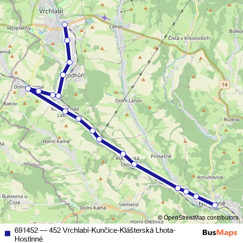 Click here to view the nearest 691452 - 452 Vrchlabí-Kunčice-Klášterská Lhota-Hostinné bus stop.