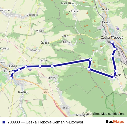The first stop of the 700933 bus route is Česká Třebová,Terminál J.Pernera and the last stop is Litomyšl,aut.nádr.. 700933 (Česká Třebová-Semanín-Litomyšl) is operational during on weekdays.