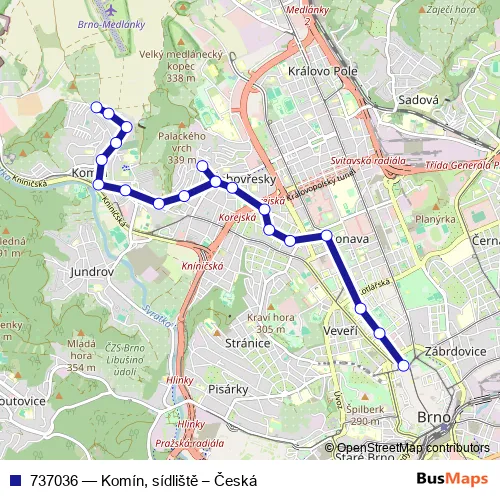 The first stop of the 737036 trolleybus route is Brno,Komín,sídliště and the last stop is Brno,Česká. 737036 (Komín, sídliště – Česká) is operational during everyday.