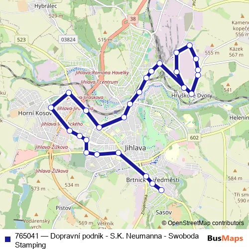 The first stop of the 765041 bus route is Jihlava, Dopravní podnik and the last stop is Jihlava, Swoboda-Stamping. 765041 (Dopravní podnik - S.K. Neumanna - Swoboda Stamping) is operational during everyday.