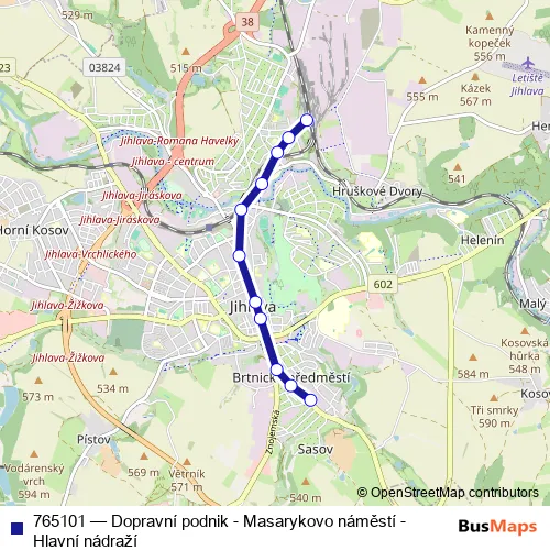 The first stop of the 765101 trolleybus route is Jihlava, Dopravní podnik and the last stop is Jihlava, Hl. nádraží Čd. 765101 (Dopravní podnik - Masarykovo náměstí - Hlavní nádraží) is operational during everyday.