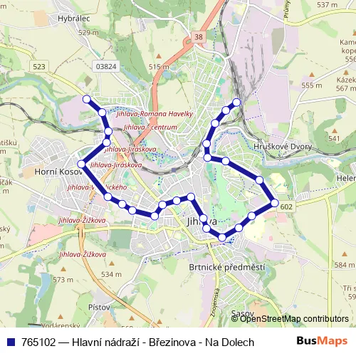 The first stop of the 765102 trolleybus route is Jihlava,Hlavní nádraží and the last stop is Jihlava,Motorpal hala. 765102 (Hlavní nádraží - Březinova - Na Dolech) is operational during everyday.