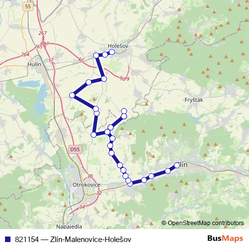 The first stop of the 821154 bus route is Zlín,aut.nádr. and the last stop is Holešov,žel.st.. 821154 (Zlín-Malenovice-Holešov) is operational during everyday.