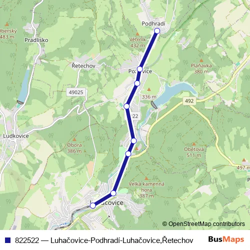 The first stop of the 822522 bus route is Podhradí and the last stop is Luhačovice,aut.st.. 822522 (Luhačovice-Podhradí-Luhačovice,Řetechov) is operational during everyday.