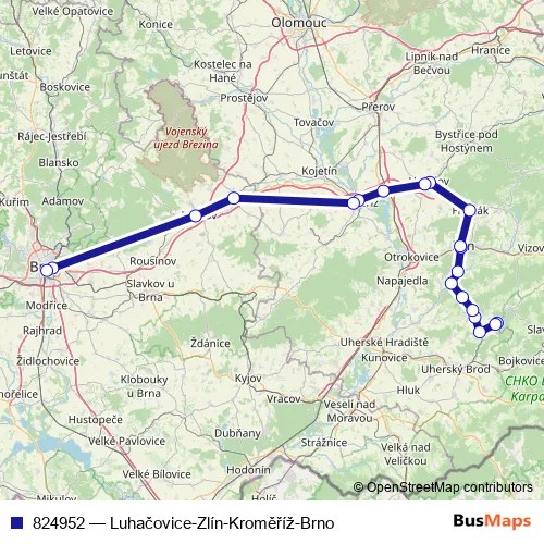 The first stop of the 824952 bus route is Luhačovice,aut.st. and the last stop is Brno,Úan Zvonařka. 824952 (Luhačovice-Zlín-Kroměříž-Brno) is operational during everyday.