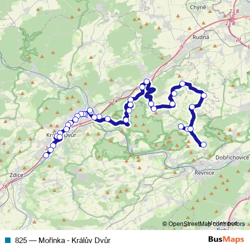 The first stop of the 825 bus route is Loděnice and the last stop is Králův Dvůr,Popovice. 825 (Mořinka - Králův Dvůr) is operational during everyday.