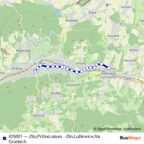 The first stop of the 825001 trolleybus route is Zlín,Lužkovice,Na Gruntech and the last stop is Zlín,Sportovní hala. 825001 (Zlín,Prštné,náves - Zlín,Lužkovice,Na Gruntech) is operational during everyday.
