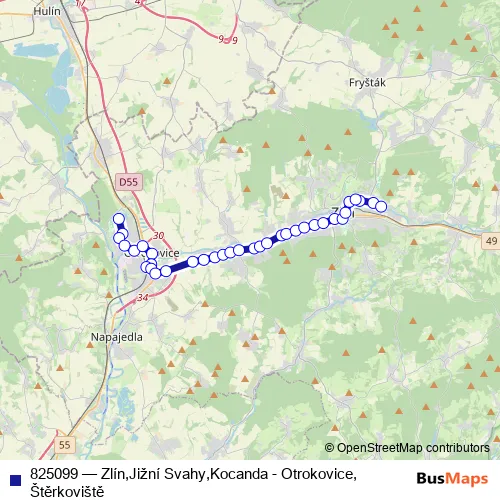 Zlín, Baťova nemocnice. 825099 (Zlín,Jižní Svahy,Kocanda - Otrokovice,Štěrkoviště) is operational during everyday.