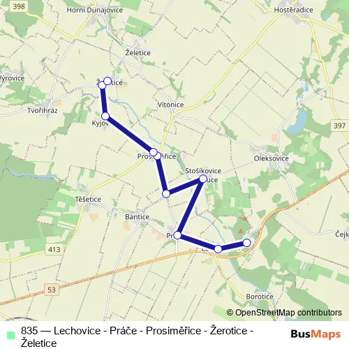 The first stop of the 835 bus route is Lechovice, zámek and the last stop is Žerotice, požární zbrojnice. 835 (Lechovice - Práče - Prosiměřice - Žerotice - Želetice) is operational during on weekdays.