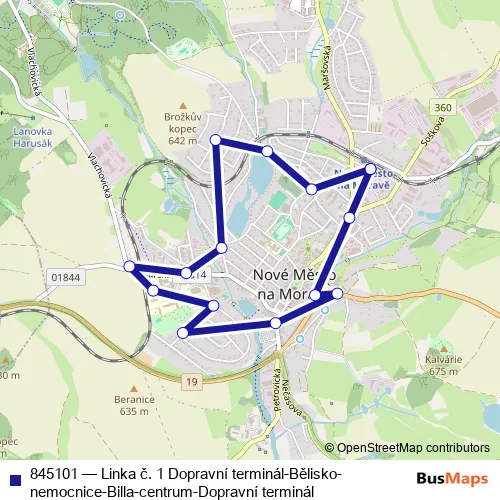 The first stop of the 845101 bus route is Nové Město na Moravě, Dopravní terminál and the last stop is Nové Město na Moravě, centrum. 845101 (Linka č. 1 Dopravní terminál-Bělisko-nemocnice-Billa-centrum-Dopravní terminál) is operational during everyday.