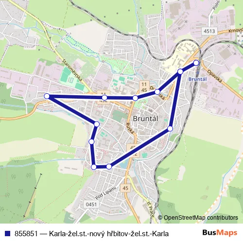 The first stop of the 855851 bus route is Bruntál,nový hřbitov and the last stop is Bruntál,žel.st.. 855851 (Karla-žel.st.-nový hřbitov-žel.st.-Karla) is operational during everyday.