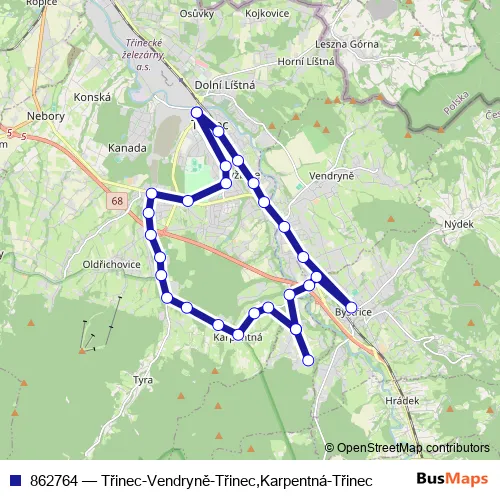 Click here to view the nearest 862764 - Třinec-Vendryně-Třinec,Karpentná-Třinec bus stop.