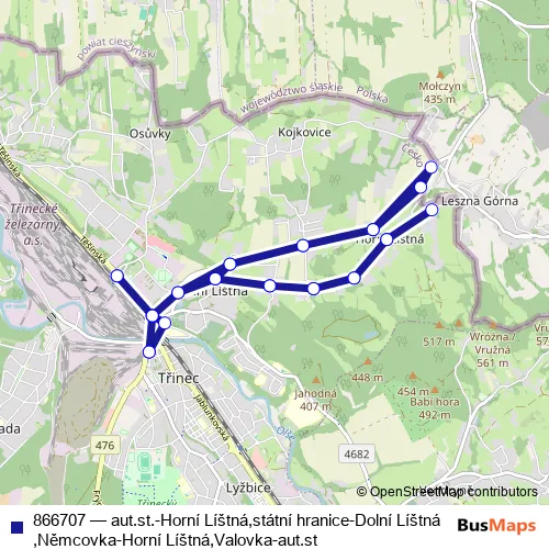 The first stop of the 866707 bus route is Třinec,aut.st. and the last stop is Třinec,aut.st.. 866707 (aut.st.-Horní Líštná,státní hranice-Dolní Líštná,Němcovka-Horní Líštná,Valovka-aut.st) is operational during everyday.