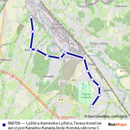 The first stop of the 866709 bus route is Třinec,Lyžbice,Kamionka and the last stop is Třinec,Konská,válcovna C. 866709 (Lyžbice,Kamionka-Lyžbice,Terasa konečná-aut.st.pod Kanadou-Kanada,školy-Konská,válcovna C) is operational during everyday.