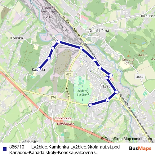 Bus 866710 - Lyžbice,Kamionka-Lyžbice,škola-aut.st.pod Kanadou-Kanada,školy-Konská,válcovna C in Trinec: Stops & Timetable