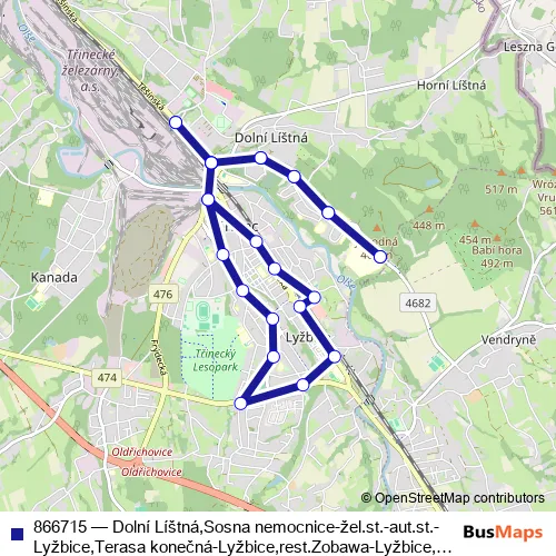 Bus 866715 - Dolní Líštná,Sosna nemocnice-žel.st.-aut.st.-Lyžbice,Terasa konečná-Lyžbice,rest.Zobawa-Lyžbice,nám.T.G.Masaryka-aut.st.-žel.st.-Dolní Líštná,Sosna nemocnice: Full Schedule in Trinec