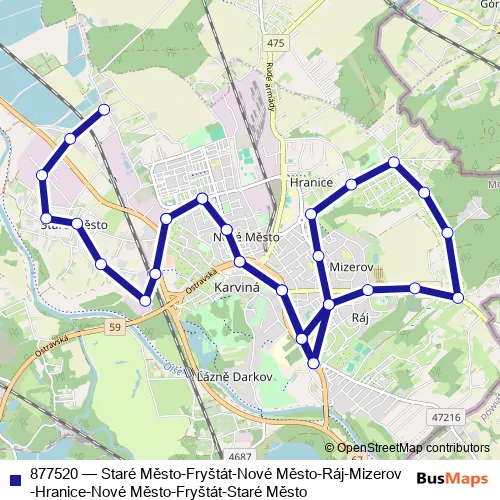 The first stop of the 877520 bus route is Karviná,Staré Město,konečná and the last stop is Karviná,Fryštát,aut.nádr.. 877520 (Staré Město-Fryštát-Nové Město-Ráj-Mizerov-Hranice-Nové Město-Fryštát-Staré Město) is operational during everyday.