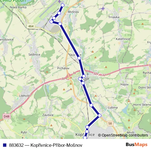 The first stop of the 883632 bus route is Kopřivnice,žel.st. and the last stop is Mošnov,Airport nádraží. 883632 (Kopřivnice-Příbor-Mošnov) is operational during everyday.