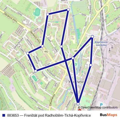The first stop of the 883653 bus route is Kopřivnice,žel.st. and the last stop is Kopřivnice,žel.st.. 883653 (Frenštát pod Radhoštěm-Tichá-Kopřivnice) is operational during on weekdays.