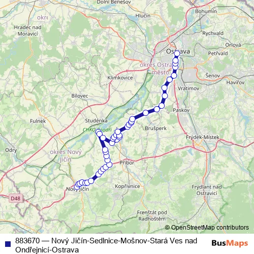 Click here to view the nearest 883670 - Nový Jičín-Sedlnice-Mošnov-Stará Ves nad Ondřejnicí-Ostrava bus stop.