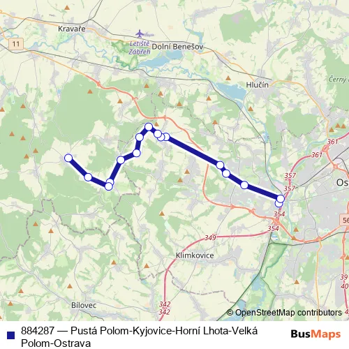 The first stop of the 884287 bus route is Ostrava,Svinov,nádraží and the last stop is Kyjovice,has.zbroj.. 884287 (Pustá Polom-Kyjovice-Horní Lhota-Velká Polom-Ostrava) is operational during everyday.