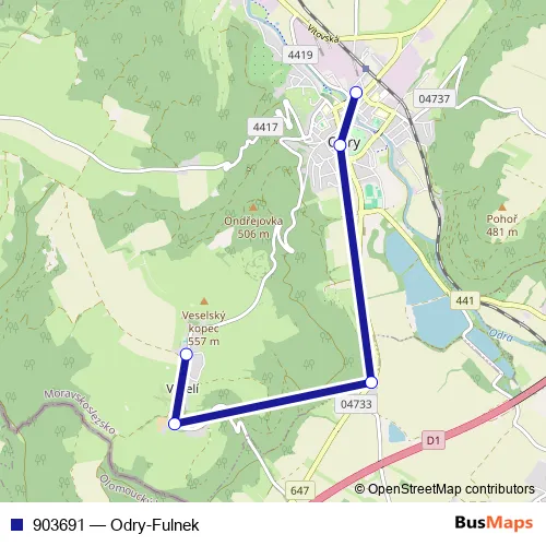 The first stop of the 903691 bus route is Odry,aut.st. and the last stop is Odry,Veselí,horní konec. 903691 (Odry-Fulnek) is operational during on weekdays.