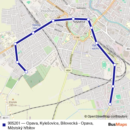 The first stop of the 905201 trolleybus route is Opava,Kylešovice,Bílovecká and the last stop is Opava,Městský hřbitov. 905201 (Opava, Kylešovice, Bílovecká - Opava, Městský hřbitov) is operational during everyday.