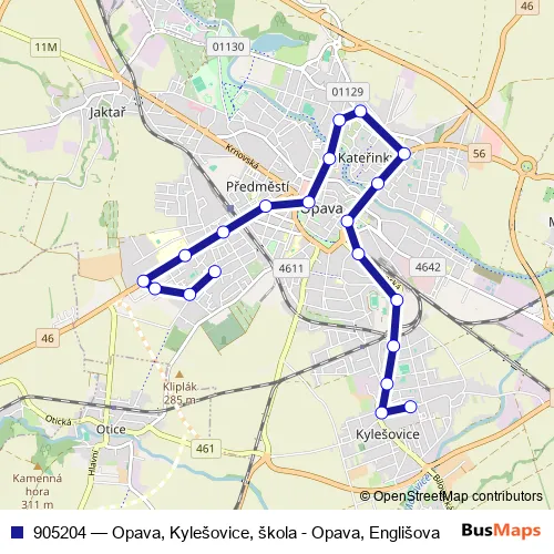 The first stop of the 905204 trolleybus route is Opava,Kylešovice,škola and the last stop is Opava,Englišova. 905204 (Opava, Kylešovice, škola - Opava, Englišova) is operational during everyday.