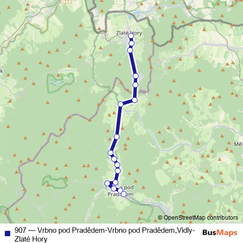 The first stop of the 907 bus route is Vrbno pod Pradědem, železniční stanice and the last stop is Zlaté Hory, autobusová stanice. 907 (Vrbno pod Pradědem-Vrbno pod Pradědem,Vidly-Zlaté Hory) is operational during everyday.