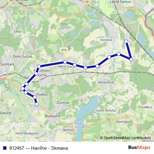 The first stop of the 912457 bus route is Havířov,Podlesí,aut.nádr. and the last stop is Stonava,Důl ČSM-Sever. 912457 (Havířov - Stonava) is operational during on weekdays.