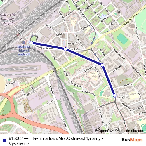The first stop of the 915002 bus route is Ostrava,Mor.Ostrava,Křižíkova and the last stop is Ostrava,hlavní nádraží. 915002 (Hlavní nádraží/Mor.Ostrava,Plynárny - Výškovice) is operational during everyday.
