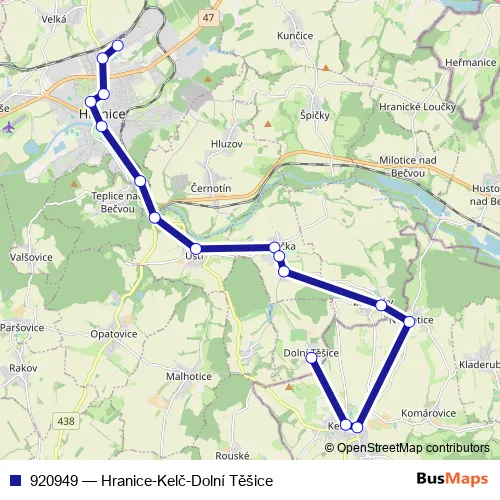 The first stop of the 920949 bus route is Hranice,aut.st. and the last stop is Dolní Těšice,Obecní úřad. 920949 (Hranice-Kelč-Dolní Těšice) is operational during everyday.