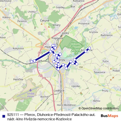 The first stop of the 925111 bus route is Přerov,Dluhonice,točna and the last stop is Přerov,Kozlovice,točna. 925111 (Přerov, Dluhonice-Předmostí-Palackého-aut.nádr.-kino Hvězda-nemocnice-Kozlovice) is operational during everyday.