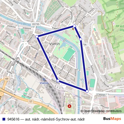 The first stop of the 945616 bus route is Vsetín,aut.nádr. and the last stop is Vsetín,aut.nádr.. 945616 (aut. nádr.-náměstí-Sychrov-aut. nádr) is operational during everyday.