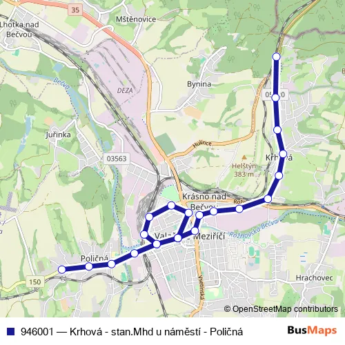 The first stop of the 946001 bus route is Krhová,točna and the last stop is Valašské Meziříčí,Stan.Mhd u náměstí. 946001 (Krhová - stan.Mhd u náměstí - Poličná) is operational during everyday.