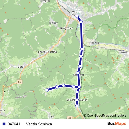 The first stop of the 947641 bus route is Seninka,Hořansko and the last stop is Vsetín,aut.nádr.. 947641 (Vsetín-Seninka) is operational during everyday.