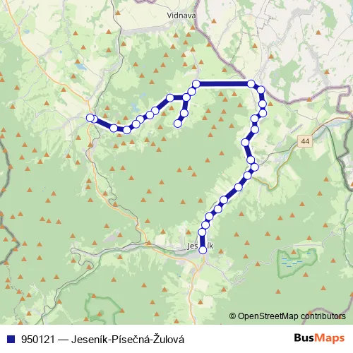 The first stop of the 950121 bus route is Jeseník,aut.nádr. and the last stop is Žulová,aut.st.. 950121 (Jeseník-Písečná-Žulová) is operational during everyday.
