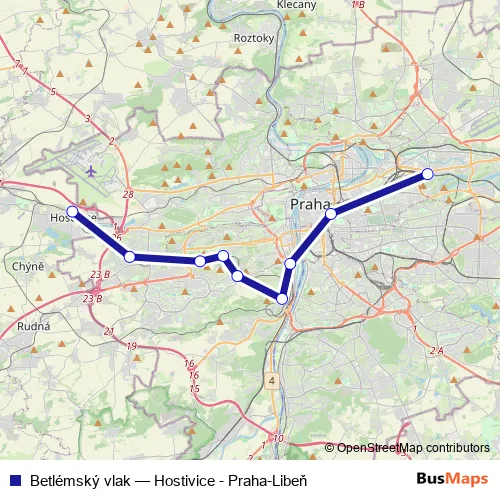 The first stop of the Betlémský vlak rail route is Hostivice and the last stop is Praha-Libeň. Betlémský vlak (Hostivice - Praha-Libeň) is operational during everyday.