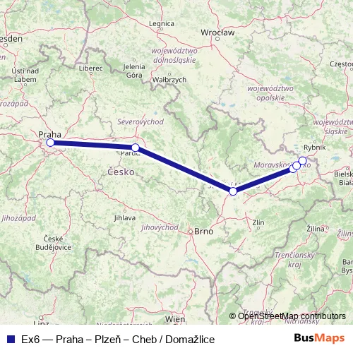 The first stop of the Ex6 rail route is Praha hlavní nádraží and the last stop is Bohumín. Ex6 (Praha – Plzeň – Cheb / Domažlice) is operational during everyday.