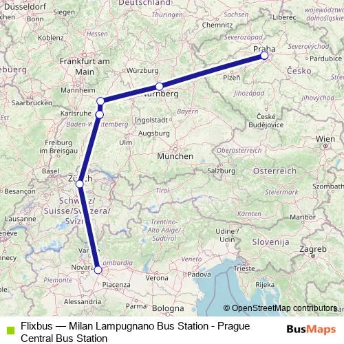 The first stop of the Flixbus bus route is Milan Lampugnano Bus Station. and the last stop is Prague Burger King Florenc Bus Station. Flixbus (Milan Lampugnano Bus Station - Prague Central Bus Station) is operational during everyday.