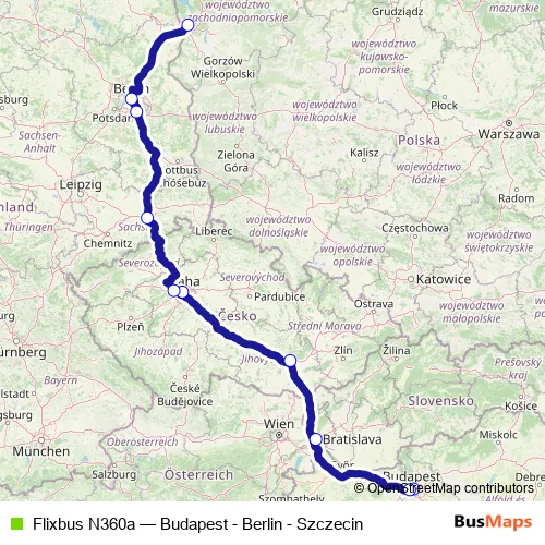 The first stop of the Flixbus N360a bus route is Szczecin, Bus Station and the last stop is Budapest Népliget bus station. Flixbus N360a (Budapest - Berlin - Szczecin) is operational during everyday.
