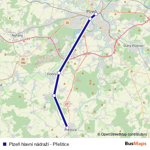 Plzeň hlavní nádraží - Přeštice rail Route Map