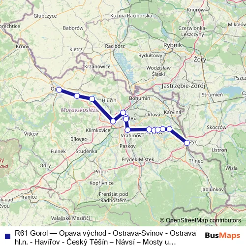 Click here to view the nearest R61 Gorol - Opava východ - Ostrava-Svinov - Ostrava hl.n. - Havířov - Český Těšín – Návsí – Mosty u Jablunkova rail stop.