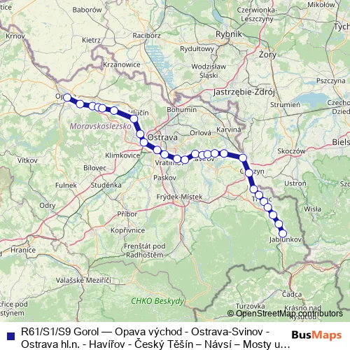 Rail R61/S1/S9 Gorol - Opava východ - Ostrava-Svinov - Ostrava hl.n. - Havířov - Český Těšín – Návsí – Mosty u Jablunkova - Opava východ – Ostrava-Svinov - Ostrava-Svinov - Ostrava-Vítkovice – Ostrava-Kunčice – Havířov - Český Těšín Schedule in Ostrava