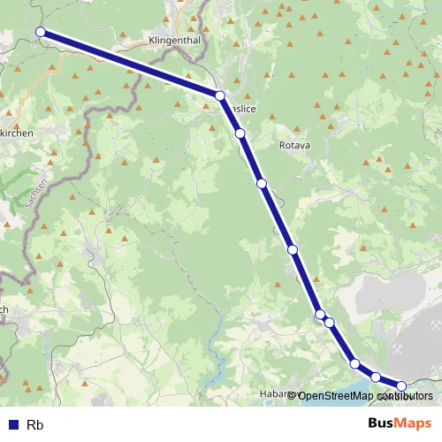 The first stop of the Rb rail route is Sokolov and the last stop is